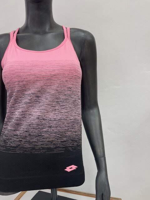 Je vous présente mon coup de coeur parmi tous ces débardeurs. Je l »aime trop ! Aussi bien parce qu’il est rose (ma couleur préf, vous le savez), que parce que j’adore cette impression dégradée et contrastée du noir et du rose. Et vous avez vu le dos ultra canon que ça fait avec les bretelles derrière ? Bref, je l’aime d’amour, et je serai trop heureuse de le voir adopté pour partir faire du sport partout où vous irez !